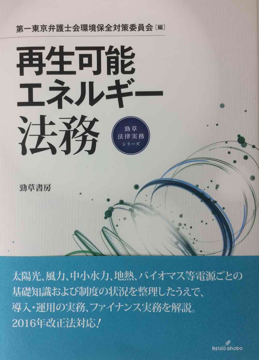 弊所中山弁護士共著「再生可能エネルギー法務」 「再生可能エネルギー法務」共著・勁草書房 2016年9月21日販売 第一東京弁護士会環境保全対策委員会 Amazon販売ページ[外部リンク]